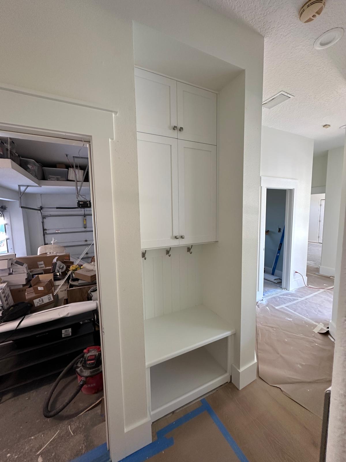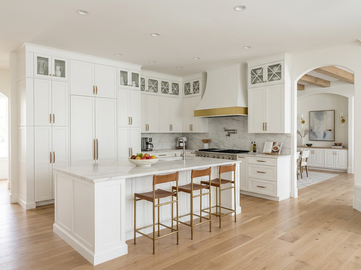Transform your kitchen with our fully custom white shaker cabinet suites, designed and crafted to your exact specifications. Featuring classic shaker-style doors, decorative mullion glass uppers, integrated crown molding, and a floor-to-ceiling pantry tower, these cabinets deliver both timeless elegance and practical storage.
