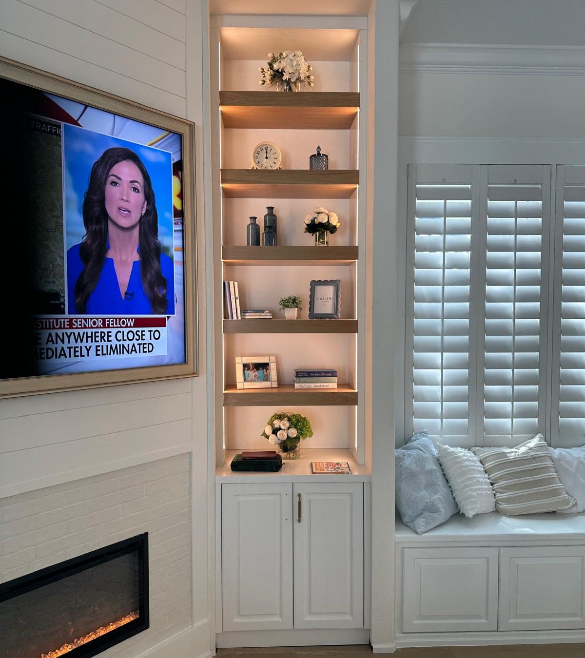 The LED lighting runs the full height of the unit, washing the back wall in soft, even light that highlights décor, books, and personal touches at every level. The contrast between the crisp white surround and the warm wood shelves gives the piece a transitional feel — equally at home in a modern or traditional interior.