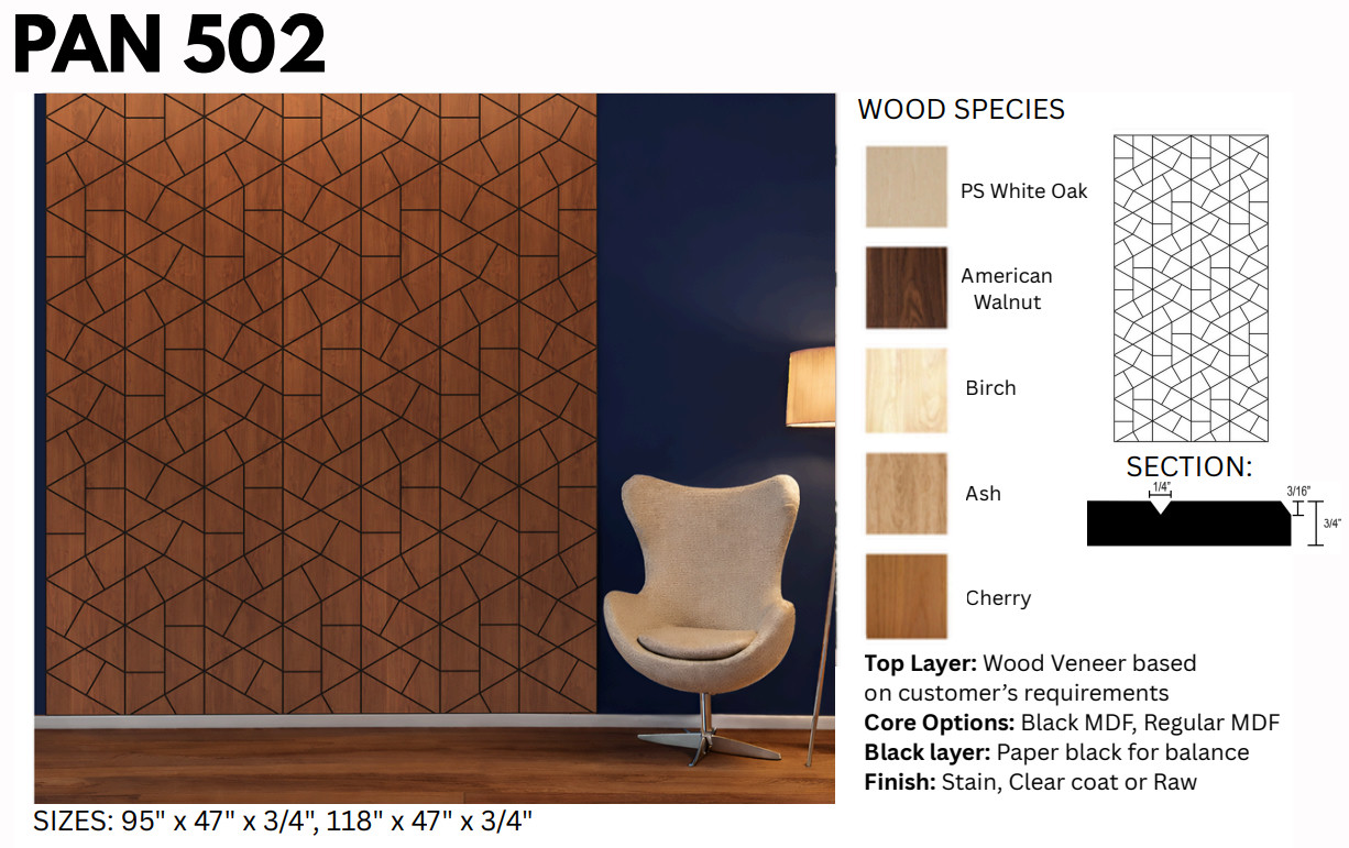 Wall Panel PAN 502 is a refined architectural wood panel designed to bring warmth, depth, and geometric sophistication to interior spaces. Featuring a striking patterned surface, PAN 502 creates a sense of movement and texture while maintaining a clean, modern aesthetic. It is ideal for feature walls, reception areas, hospitality interiors, offices, and high-end residential projects.