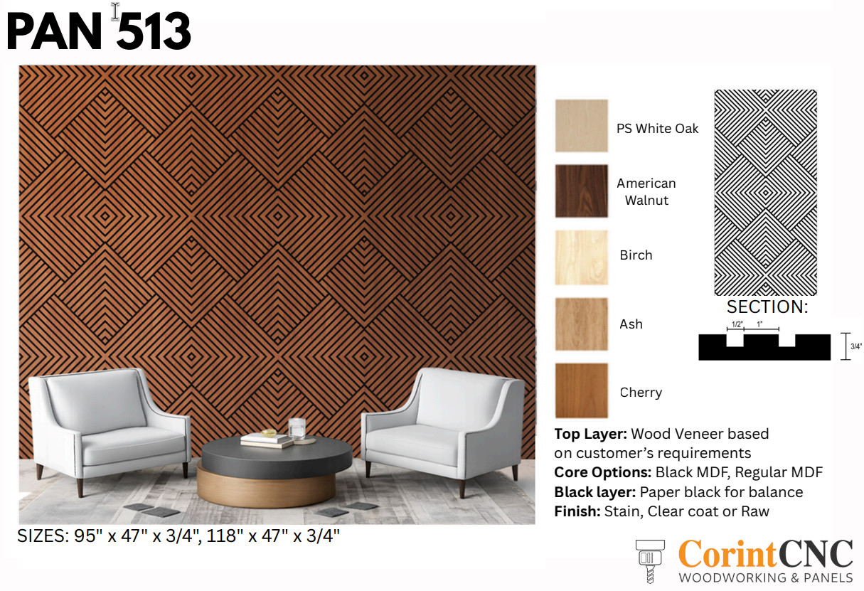 PAN 513 is a modern architectural wall panel developed to introduce subtle movement, texture, and dimensionality into interior spaces. Its precision-milled surface profile creates a balanced interplay of light and shadow, offering visual depth while preserving a clean, contemporary aesthetic.